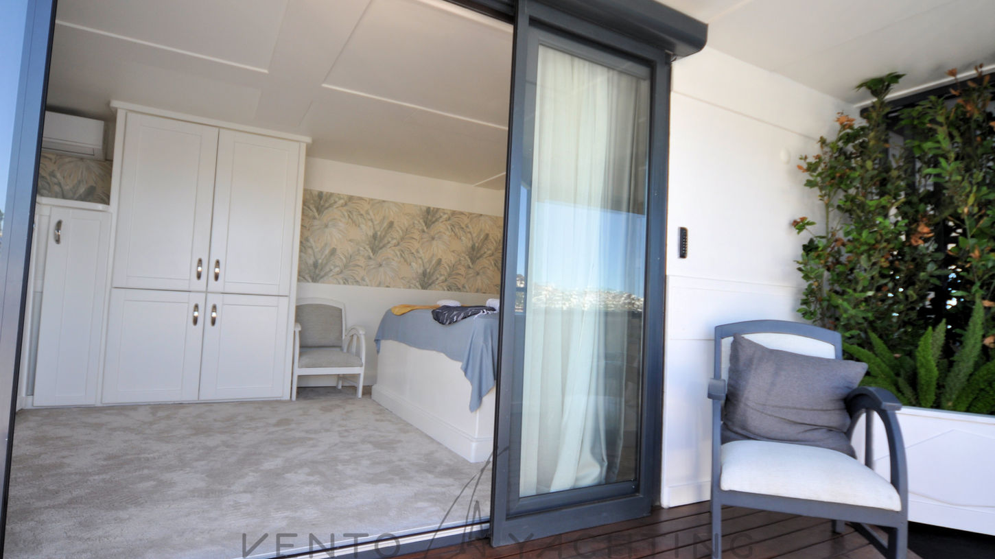 Each cabin has a bathroom, and there are also two shared toilets Spacious sunbathing and relaxation area on the upper front deck